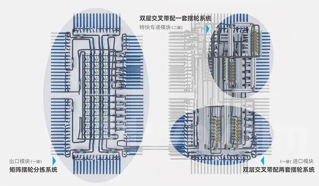 配置一套雙層小件分揀機(jī)系統(tǒng)用于特快專遞小件和文件處理,配置一套矩陣擺輪分揀系統(tǒng)用于特快專遞大件、總包郵件的處理和傳輸。