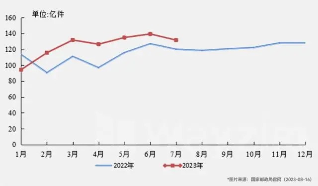國家郵政局監(jiān)測數(shù)據(jù)顯示,2023年1月~7月,郵政行業(yè)寄遞業(yè)務(wù)量累計完成873.7億件,同比增長12.8%。其中,快遞業(yè)務(wù)量(不包含郵政集團(tuán)包裹業(yè)務(wù))累計完成703.0億件,同比增長15.5%。2023年郵政行業(yè)寄遞業(yè)務(wù)量較2022年顯著提升。